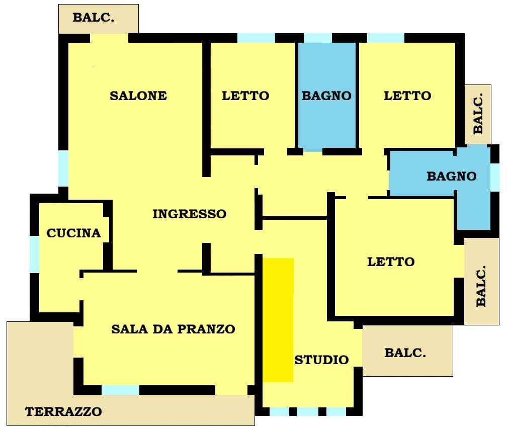La sola abitazione è di circa Mq. 160 ed è costituita da un Ingresso, Grande Salone con camino e zona Salotto, Sala da Pranzo, Cucina Semi-abitabile, 3 Camere da Letto, 1 Studio, 2 Bagni, 3 Balconi, 1 Terrazzo con BARBEQUE in muratura, Ripostiglio, TAVERNA, Lavanderia, Cantina e Garage.